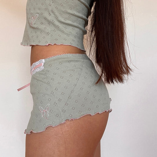 蝶々 Chouchou Butterfly and Bow Embroidered Pointelle Shorts Green