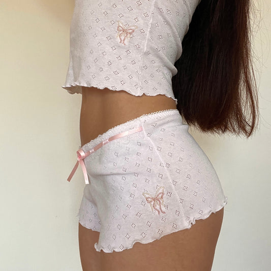 蝶々 Chouchou Butterfly and Bow Embroidered Pointelle Shorts White
