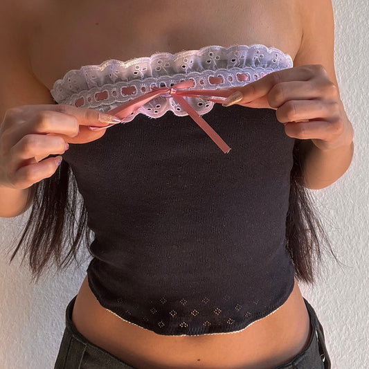 蝶々 Chouchou Butterfly and Bow Embroidered Pointelle Top Black