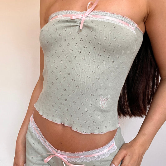 蝶々 Chouchou Butterfly and Bow Embroidered Pointelle Top Green