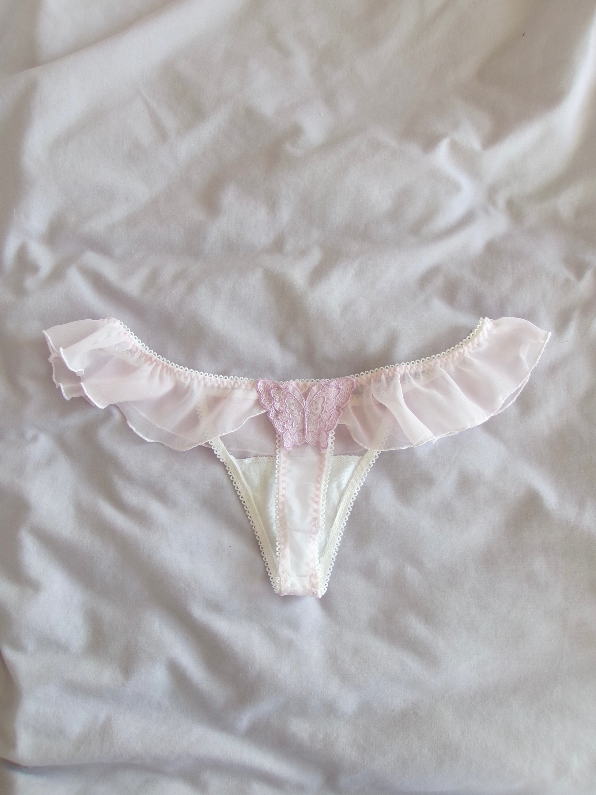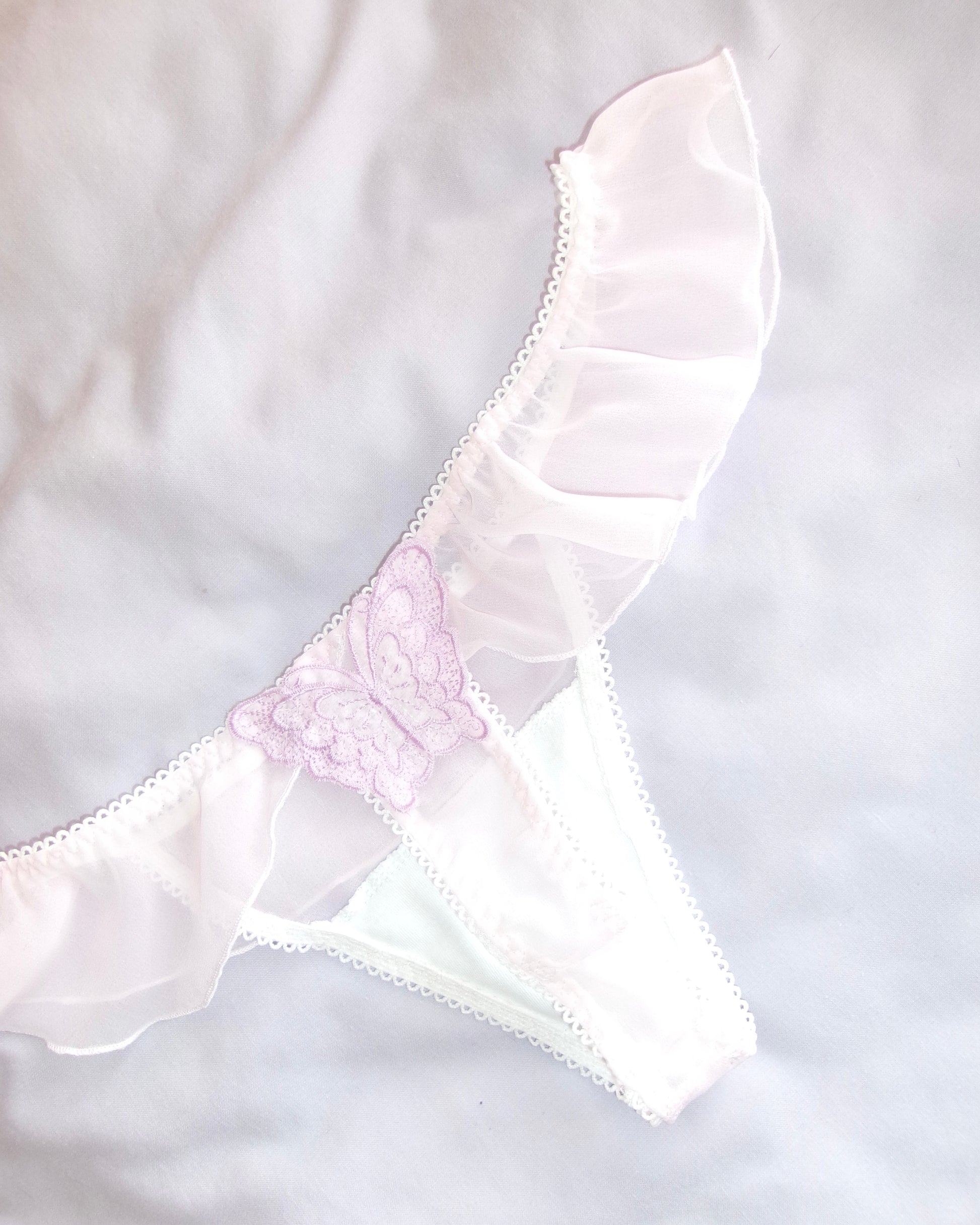Handmade Sheer Chiffon Ruffle Thong With Embroidered Butterflies